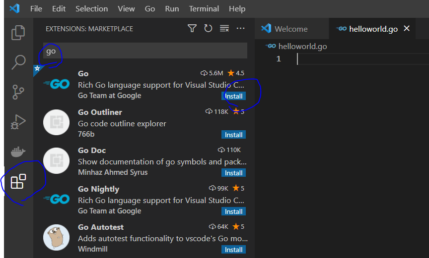 visual studio code에서 extention을 설치해야 go 문법에 따라 작성하기 쉬워지고 디버깅 하기 편리해진다.