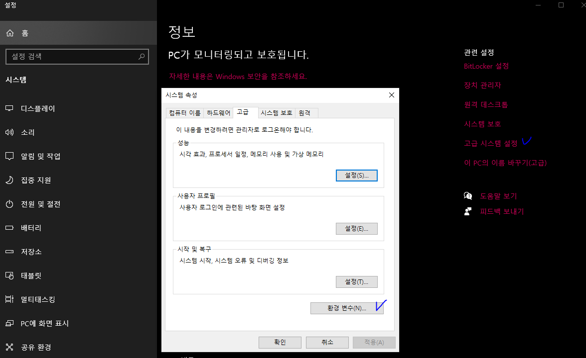 환경변수 확인 방법은 더보기로..