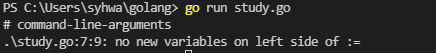 💡 강의 동영상에서는 에러 없이 실행 가능했는데, 내가 해보니 새로운 변수가 아닌 변수를 선언할 수 없다는 에러가 발생한다. 나의 go 버전은 1.17.2 ....... 동영상 강의에서 왜 에러가 발생하지 않았는지 너무 궁금.... ㅠㅠ 아시는 분 Comment 좀...!