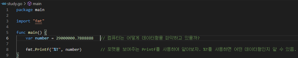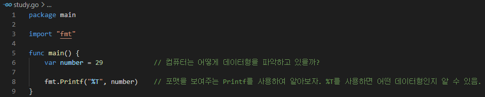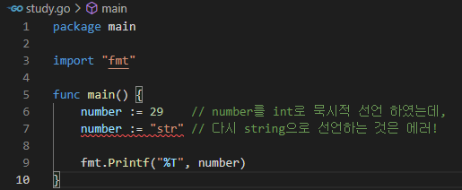 number := 29로 선언하여 컴퓨터가 number를 int로 알아들었는데, 아래에서 데이터 형을 변경하여 다시 선언하였다. number := "str" 는 컴퓨터가 string으로 알아듣는다.