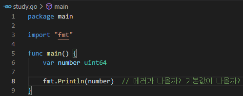 uint64형의 number라는 변수를 선언만하고 값을 넣지 않았다. number를 출력하면 uint64의 기본값이 나온다.