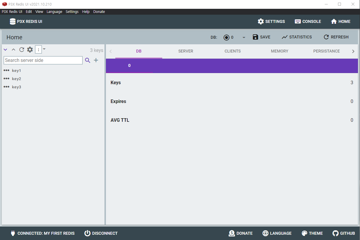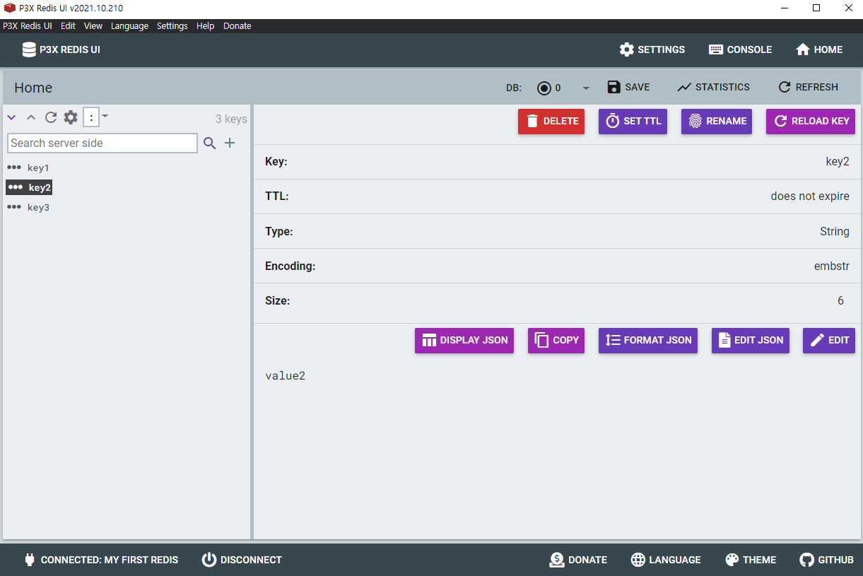 왼쪽에는 저장된 key list들이 보이고 key를 클릭하면 값을 볼 수 있다. EDIT 버튼으로 값을 변경할 수 있고 type, size 내용들도 확인 가능하다.