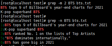 - 출력 결과가 너무 많은 경우 -m 옵션을 사용하여 검색 결과를 제한할 수 있다. 예시의 경우 두 줄만 출력되도록 했다. (앞쪽부터 두 줄이 출력됨)
