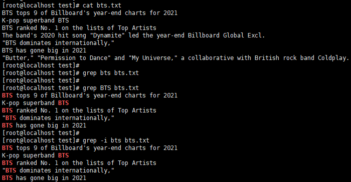 "BTS"라는 단어가 포함된 bts.txt를 생성하였다. 이 파일에는 "bts"라는 단어는 없다.