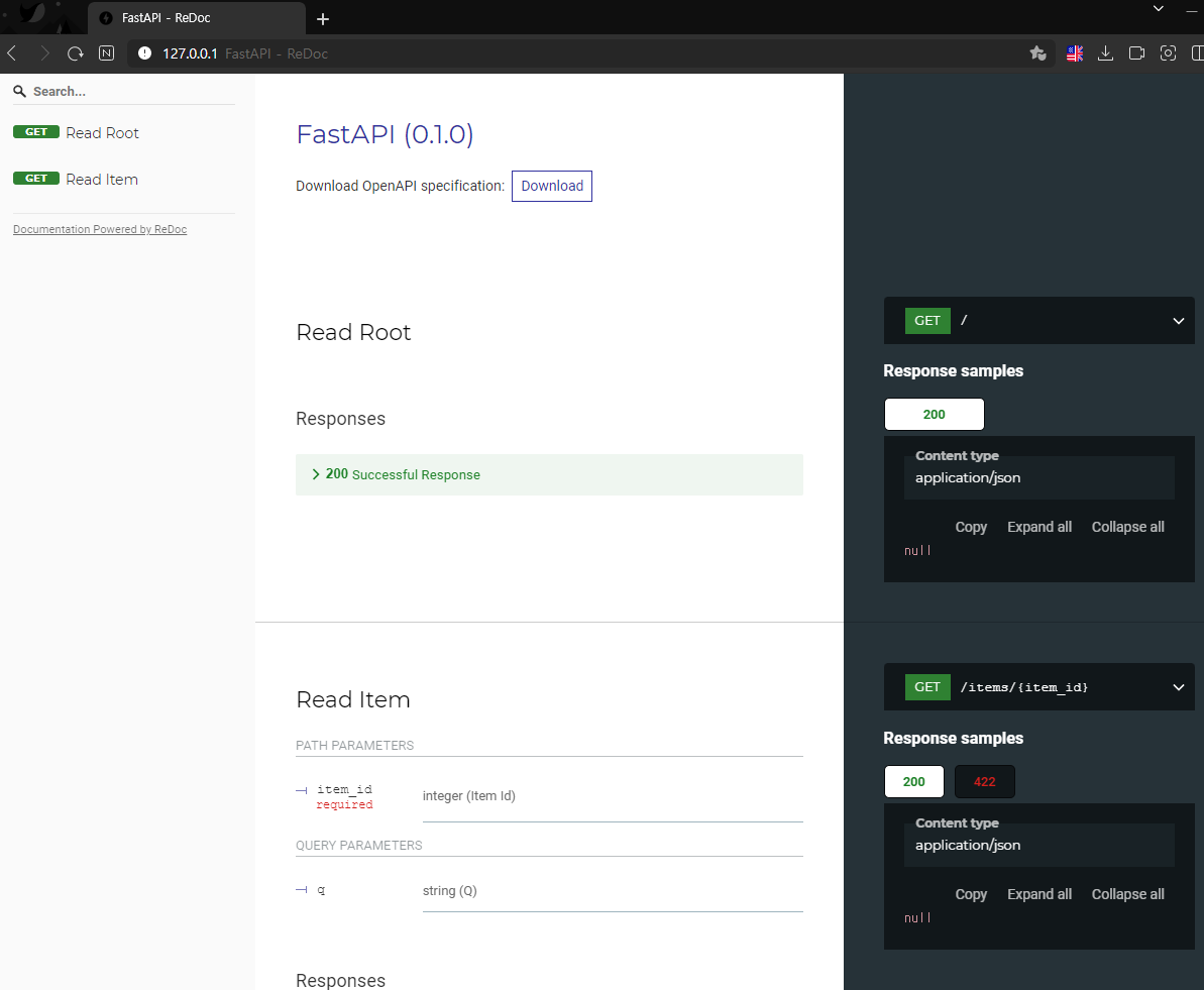 http://127.0.0.1:8099/redoc 로 가보면 swagger ui와는 다른 ui의 문서를 볼 수 있다. 좀 더 깔끔하고 보기 편한 느낌.