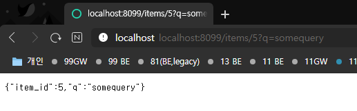 http://127.0.0.1:8099/docs 로 가보면 swagger ui 도 자동생성 되어 있음을 볼 수 있다. 싱기방기~