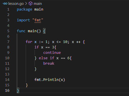 x가 6인 경우 fmt.Println(x)문장도 실행되지 않고 x가 7,8,9,10인 경우 모두 실행되지 않고 바로 반복문 실행을 중지하고 빠져나간다.