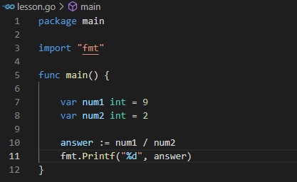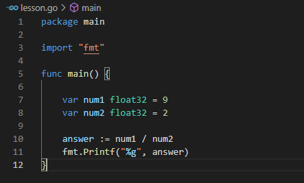 아래와 같이 float64형 변수 2개를 선언한 후 나눗셈 연산을 하였다.