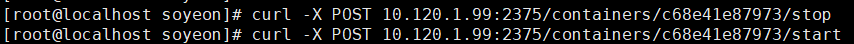 [root@localhost soyeon]# curl -X POST 10.120.1.99:2375/containers/c68e41e87973/stop