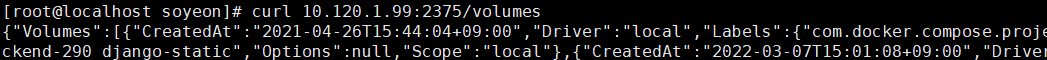 [root@localhost soyeon]# curl 10.120.1.99:2375/volumes