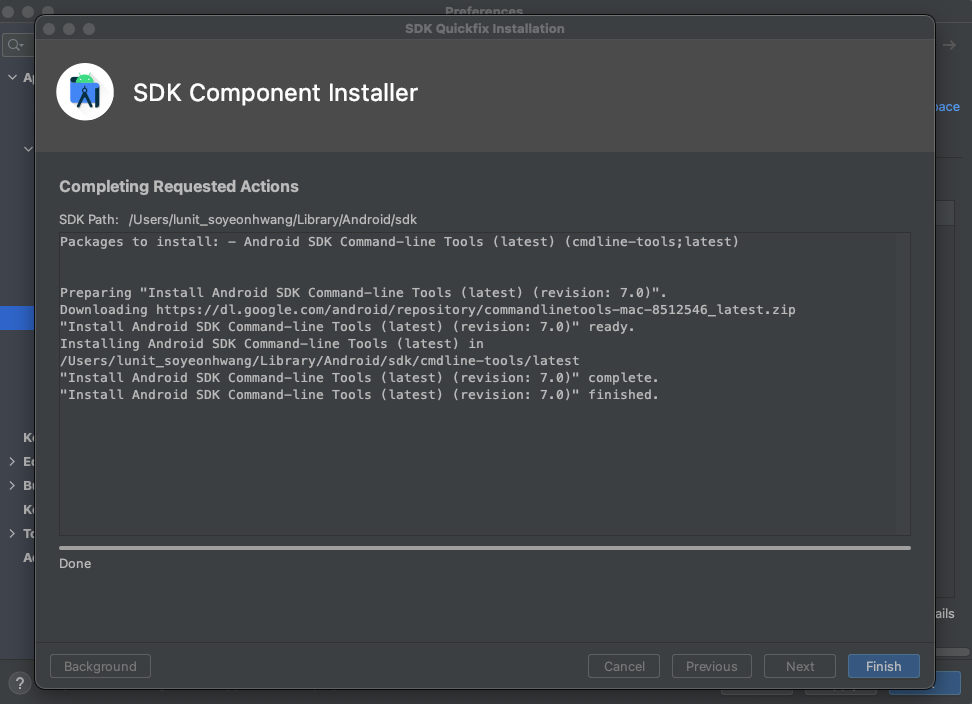 android studio를 실행하여 SDK Manager > SDK Tools > Android SDK Command-line Tools 선택하여 설치